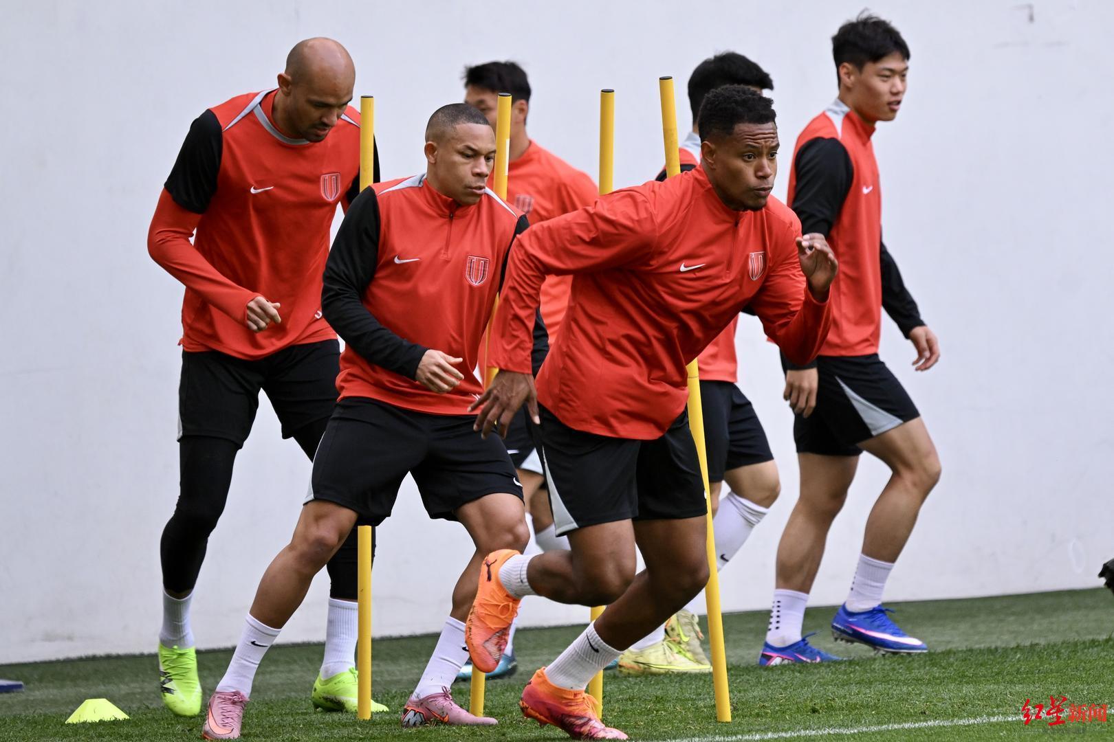 ▲成都蓉城队员正在进行赛前踩场训练